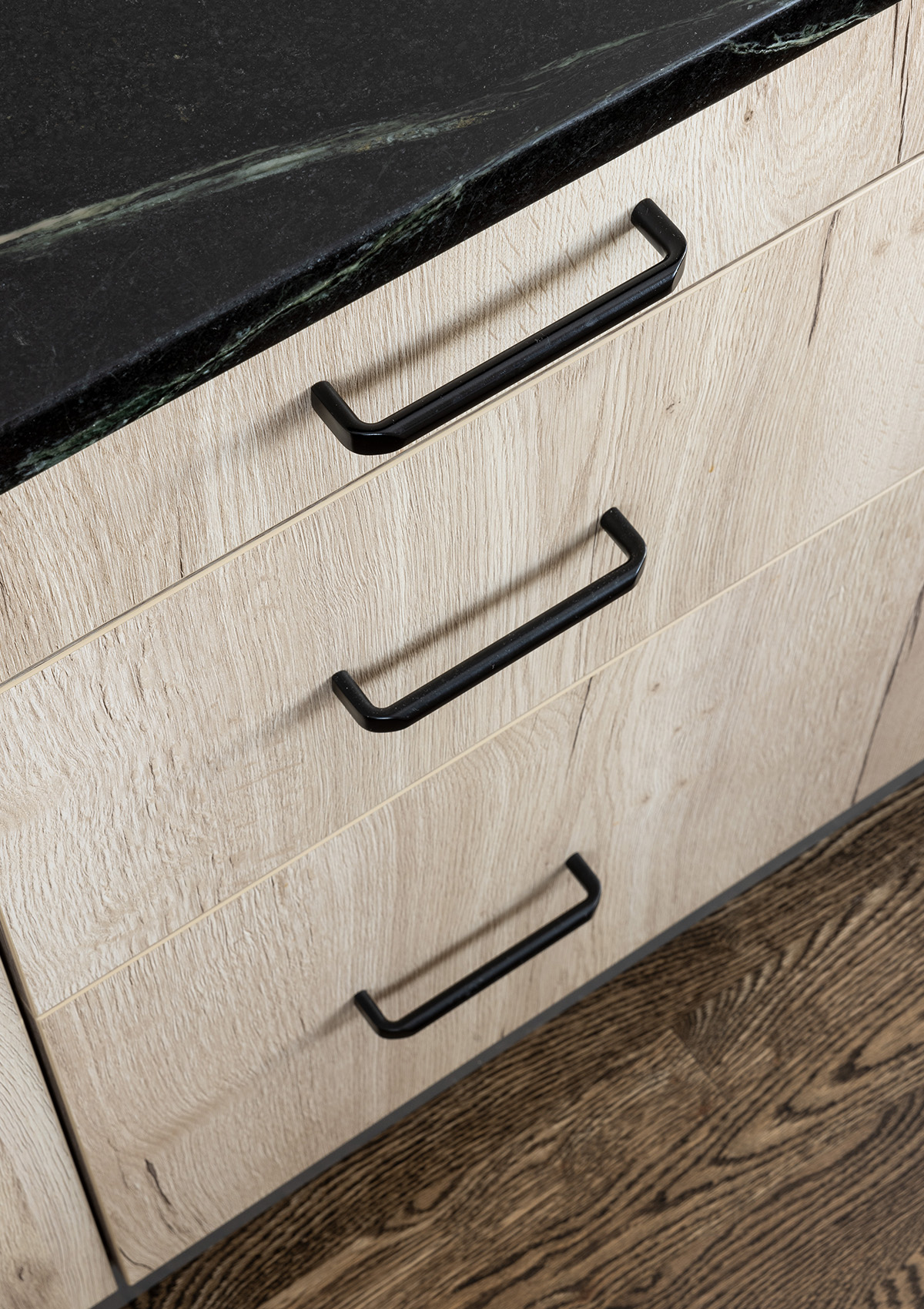 The homeowners desired a kitchen that felt warm and inviting while maintaining a clean, modern aesthetic. The designer achieved this balance by selecting Häcker Kitchens' AV 1097 Sand Vintage Oak cabinet fronts, which introduce natural warmth and organic texture into the space. The oak decor laminate creates a welcoming ambiance, allowing sunlight from the adjacent rooms to enrich the kitchen’s atmosphere.