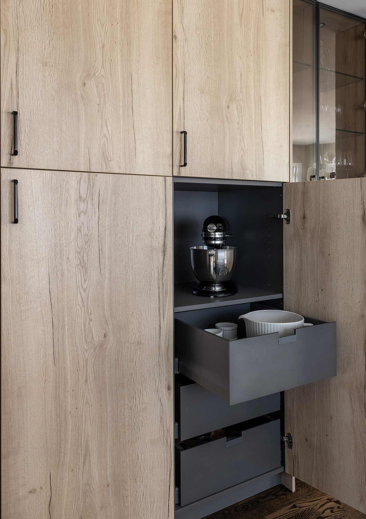 Beyond aesthetics, functionality played a crucial role in the project’s design. Häcker Kitchens’ Metro Box R pull-outs and drawers, featuring a 72mm high side profile, were integrated to optimize storage capacity and provide smooth, ergonomic access to kitchen essentials. These highly durable pull-outs, combined with dark grey ash interior organization accessories, ensure a clutter-free environment and maximize efficiency.