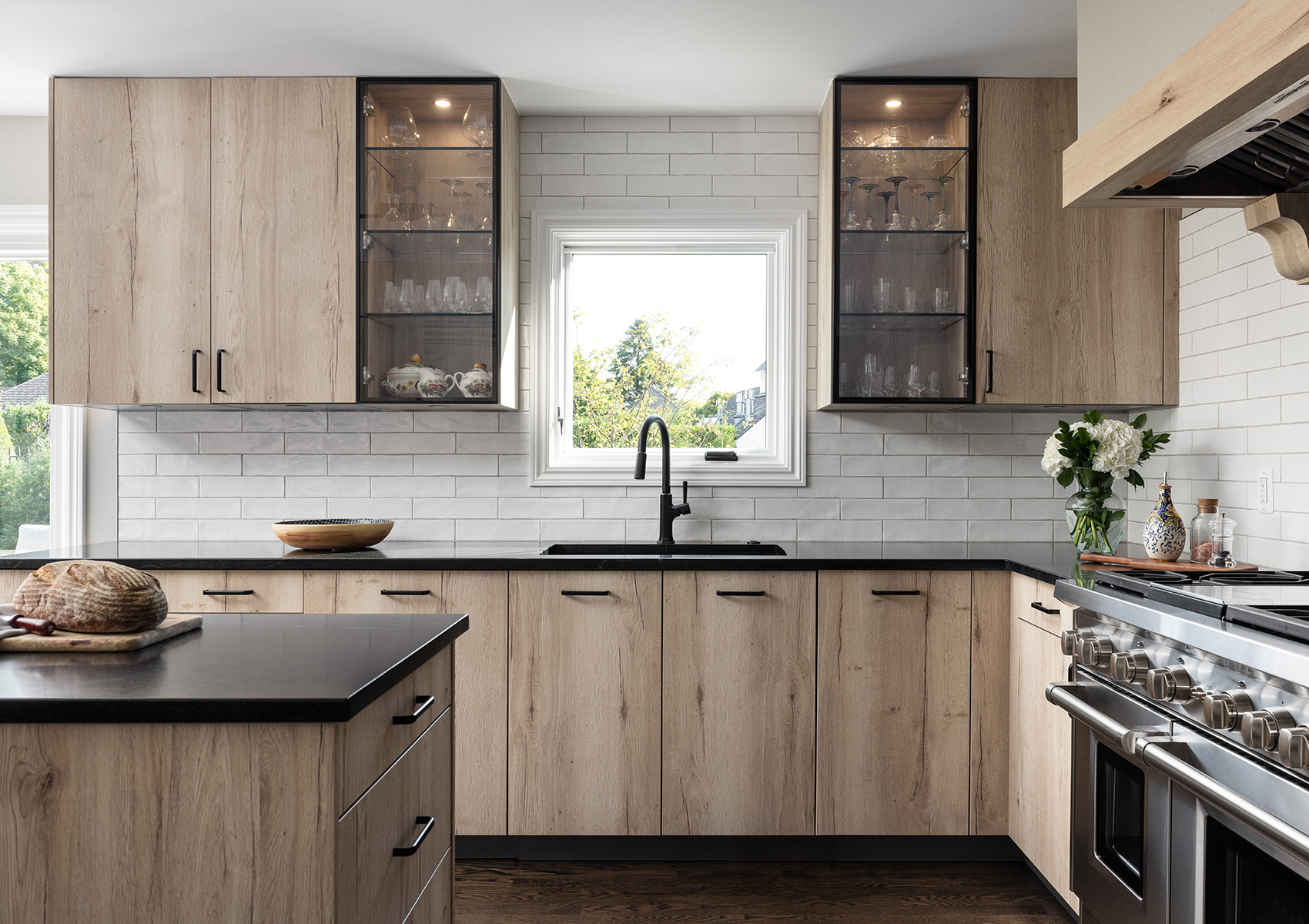 To complement the wood elements, the design incorporated glass wall cabinets with slim black frames and wood decor interiors. These cabinets add a touch of sophistication and openness, offering a visual contrast to the oak while maintaining a cohesive look. The delicate black frames provide a minimalist edge, reinforcing the modern appeal of the kitchen.